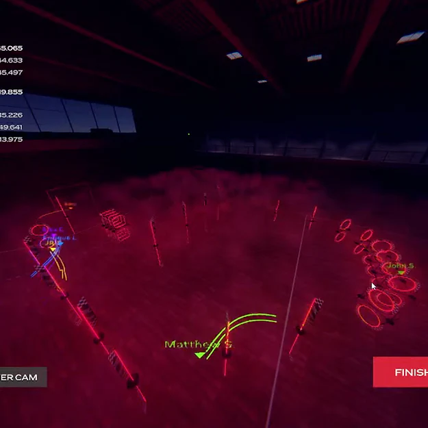 Students pilot races via the Orqa FPV.SkyDive simulator, which mimics real drone physics and racing conditions.